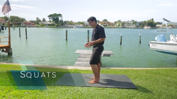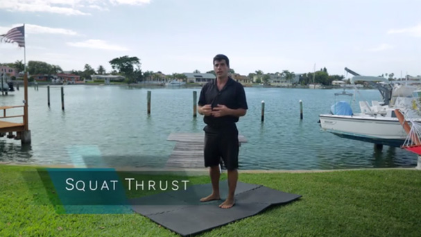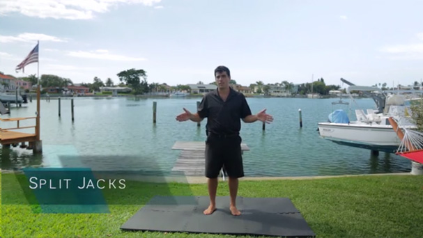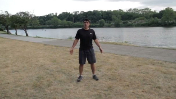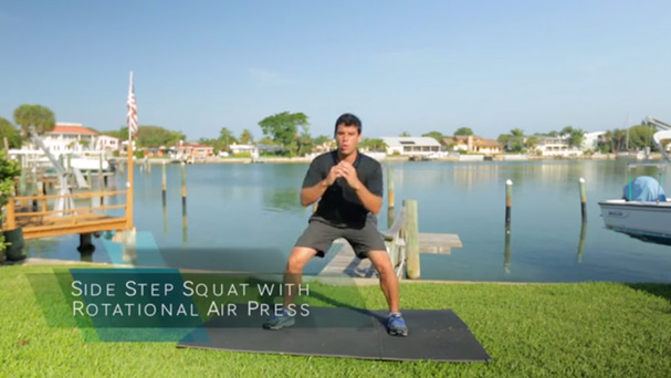 3. Side step squat with rotational air press (focus on changing direction as fast as you can from the up and down positions); as soon as you slow down and can no longer keep a sprint pace, rest until the following set.